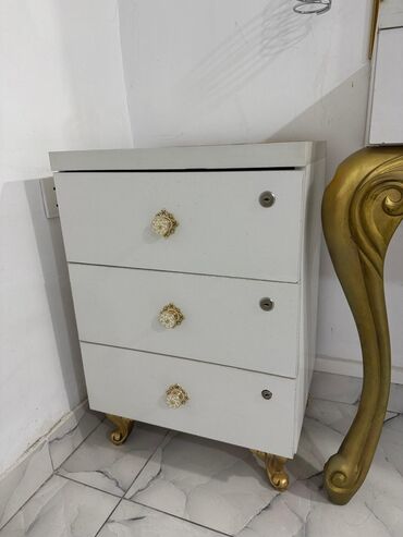 - 2 ədəd çekmeceli tumbə: hər birində 3 dərin çekmece, qızılı dekorativ tutacaqlar, kiçik təkərli ayaqlar.