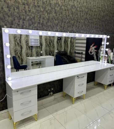- Böyük vizaj güzgüsü: LED lampalı, çərçivə boyunca bərabər işıqlandırma. Uzun, geniş masa üstü ilə 3 ayrı iş yeri üçün nəzərdə tutulub. Hər iş yerində 3 çekmecəli dolab və açarlı yuxarı çekmece. Qızılı rəngli dekorativ ayaqlar, ağ rəngli korpus. Elektrik qoşması üçün yan hissədə çıxışlar görünür. Peşəkar makiyaj, saç və stilinq üçün uyğundur.