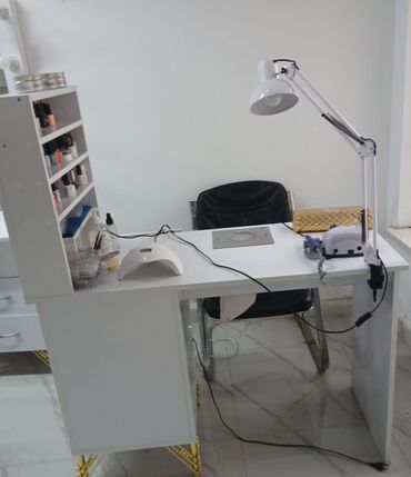 - Manikür masası: Ağ rəngdə, bir tərəfdə şüşəli/raf modullu lak və aksesuar rəfi, digər tərəfdə üç çekmecə. Masanın ortasında tozsoran üçün dairəvi çıxarışlı hissə. Mexaniki qol lampası üçün kənar sıxaclı yer; masada elektrik avadanlıqları üçün uyğun sahə. Qızılı dekorativ ayaqlar.