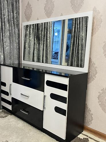 Taxta komod-güzgü dəsti - Material: ağac teksturalı laminat/LDSP, tünd haşiyələr və dekor zolaqları ilə - Üst hissədə iri, ensiz-uzun, asimmetrik künclü güzgü (stolüstü panelə bərkidilmiş) - Saxla...