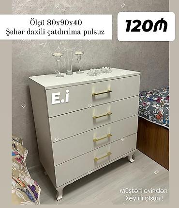 - Model: müxtəlif dizaynlarda 4 siyirməli komod (ağ, ağ/taxta kombin, fərqli tutacaq variantları)