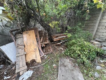 - Həyətin içində köhnə taxta materialları, paletlər və qapı-çərçivə qalıqları