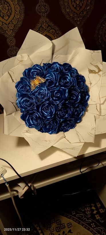 Saten lentlərdən hazırlanmış, qızılı kəpənəklərlə bəzədilmiş gül dəsti. Bu dəstə toy, ad günü və ya digər xüsusi günlər üçün gözəl hədiyyə ola bilər. Həmçinin, interyerinizə zəriflik qatacaq dekora...