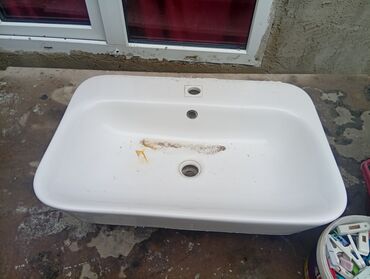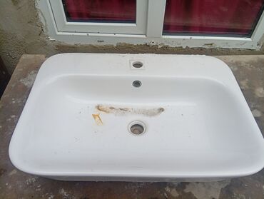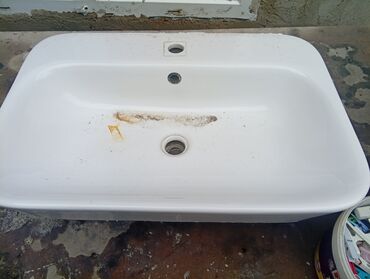 - Seramik lavabo: düzbucaqlı formaya yaxın, yumru künclü, üstdən quraşdırma üçün. Orta hissədə drenaj, arxa hissədə daşma və qarışdırıcı üçün deşik mövcuddur. Ağ rəng, hamar parlaq səth. Stolüstü və ya şkafüstü montaja uyğundur.