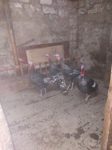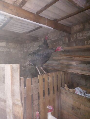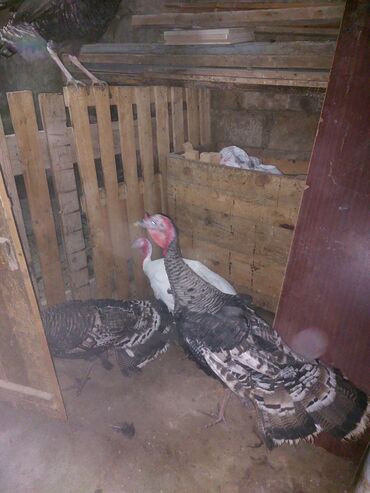 - Şəkillərdə görünən qara-çalar naxışlı və bir neçə ağ rəngli hinduşkalar.