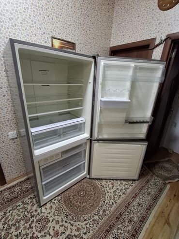 - Üst hissə geniş soyuducu bölmə: bir neçə tənzimlənən şüşə rəf, böyük tərəvəz/mevə çekmecəsi, qapıda yumurta və butulka üçün rəflər