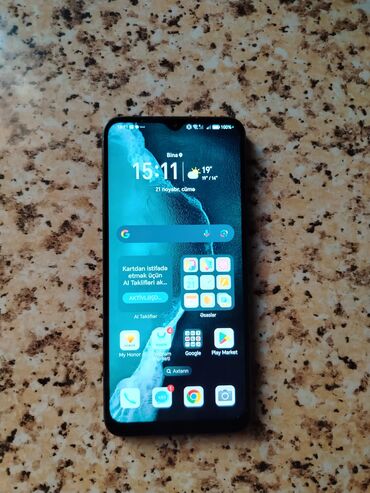 HONOR smartfon - Brend/model: HONOR (arka tərəfdə rəsmi loqo və IMEI etiketli) - Rəng: Qara, qızılı konturlu kamera bloku - Ekran: Tam ekran, damla formalı ön kamera çıxıntısı; Google tətbiqləri v...