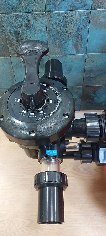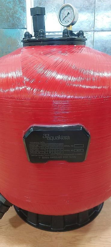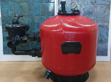 - Qum filtri sistemi: manometrli qapaq, çoxyollu kran, giriş‑çıxış fitinqləri ilə komplekt; korpus fiberglas/kompozit tipli iri həcm.