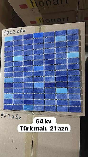 - Şüşə mozaika nümunəsi: ölçü 1.9 × 3.8 sm parçalardan tərkibli vərəq; ümumi sahə 64 kv göstərilir. Türk istehsalı. Qiymət şəkildə göstərilib: 21 AZN.