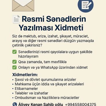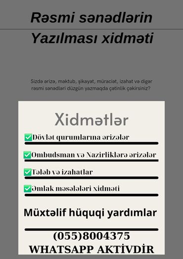 İddia ərizələrinin, şikayətlərin hazırlanmasıRəsmi sənədlərin yazılması və hüquqi məsləhət xidməti
