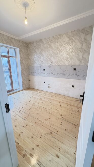 - Döşəmələr tam taxta (laklı), divarlar oboy və dekorativ suvaqla.