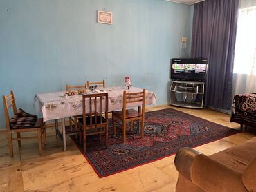 - Daxili plan: işıqlı zal (fotoda), pəncərəli, pərdə və xalça ilə; yemək masası yerləşir, TV üçün yer və elektrik xətti çəkili.
