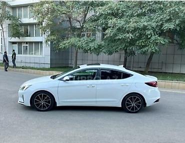 Hyundai Elantra sedan (ağ rəng). Xarici dizayn: iri xrom ön barmaqlıq, projektor tipli ön faralar, LED arxa işıqlar, “shark fin” antena, tonlanmış şüşələr, aerodinamik gövdə xətti. Yüngül lehimli d...