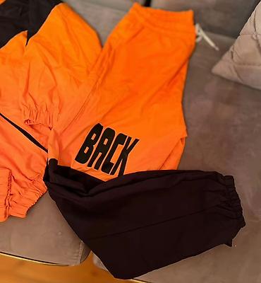 - Şalvar: Elastik kəmər və iplə sıxlanma; bir balaqda qara blok, narıncı hissədə “BACK” çapı