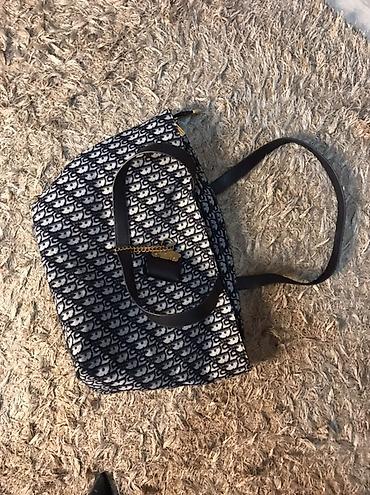 - Rəng: tünd mavi/qara-ağ monoqramlı parça