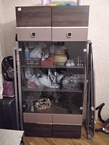 Mebel dəsti – iri vitrinli-saxlama sistemi - Material: tünd qəhvəyi MDF/laminat kombinasiya, klassik frezli qapılar. - Komplekt: çoxsaylı şkaf bölmələri, yüksək dolablar, asma qutular, açıq rəflər...