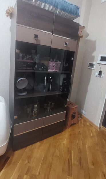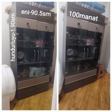 Şkaf-vitrin dəsti və TV altlığı ikinci el satisi qiymetle baqli elaqe saxlayin - Material: tünd qəhvəyi rəngdə MDF/taxta karkas, ön hissələrdə şüşə vitrin qapıları - Dəstdə 3 mebel: 1) Dar vitr...
