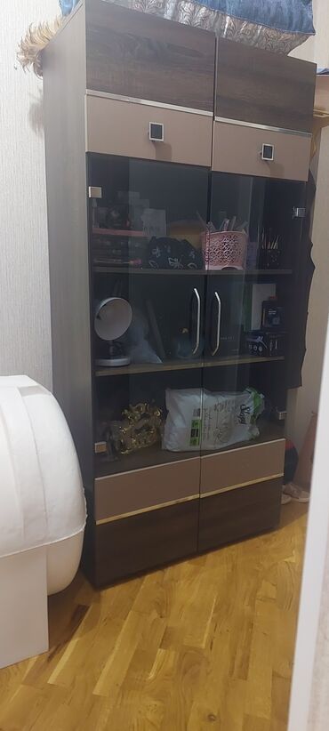 Yemək qabları vitrini və böyük paltar dolabı dəsti - Vitrin: klassik taxta dizayn, şüşə qapılı üst bölmə və aşağıda çekmece/şkaf bölmələri. Servis qabları, fincanlar və dekor üçün geniş rəfli quru...