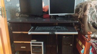 - Kompüter masası: qəhvəyi rəng, üst rəf monitorlar üçün, klaviatura üçün çəkilən rəf, solda 3 çekmecə, sağda sistem bloku üçün bölmə