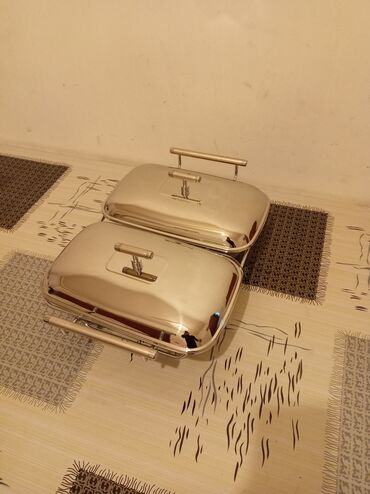 - İkili bufet qabı: Paslanmayan poladdan iki bölməli isti saxlayan servis qabı. Üstü qapaqlı, yanlarda daşıma tutacaqları var. Daxildə şüşə istiliyədavamlı kasalar görünür. Masaüstü şamlıq/isti saxlayıcı ayaqları mövcuddur – yeməkləri uzun müddət isti saxlamaq və şık servis üçün uyğundur. Banket, dəvət və gündəlik istifadə üçün praktikdir.