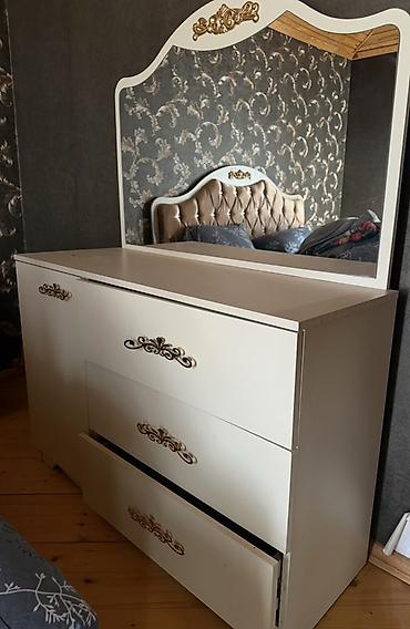 • Komod-güzgü: böyük dekorativ çərçivəli güzgü, 3 geniş çekmece + yan bölmə