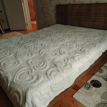 - Çarpayı: aşağı profilli, geniş ölçülü iki nəfərlik model. Başlıq hissəsi taxta teksturalı panel ilə. Üzərində naxışlı ağ örtük görünür. Stabil karkas, sakit və müasir dizayn.