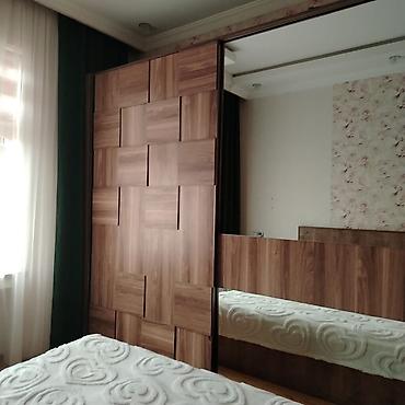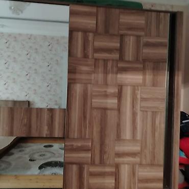 - Şkaf: sürgülü qapılı böyük qarderob. Qapıların biri tam boy güzgülüdür, digəri mozaika effektli taxta panellərlə işlənib. Geniş saxlancla təmin edir, otağı vizual böyüdən güzgü səthi var.