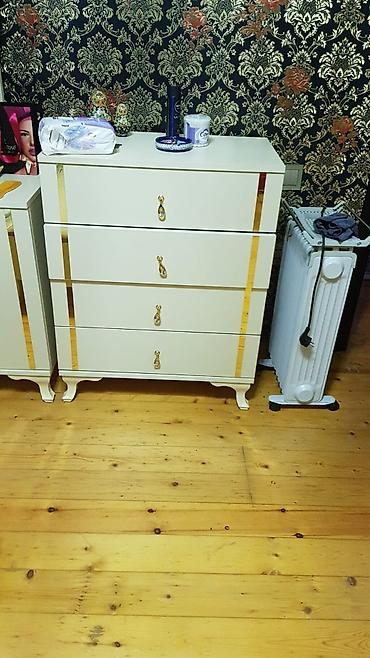 - Komod: 4 çekmecəli, krem rəng, qızılı haşiyələr və eyni üslubda tutacaqlar. Geniş saxlama imkanı.
