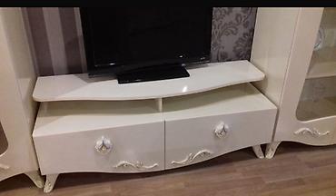 - TV stendi: iki iri çekmece, açıq rəf bölməsi; dekorativ tutacaqlar və oyma elementlər.
