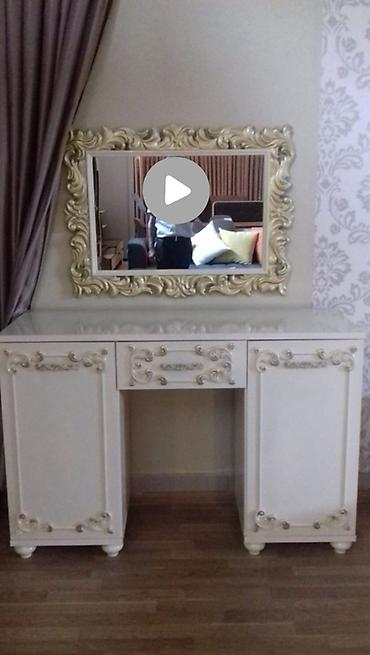 - Makiyaj masası və güzgü: geniş stol səthi, orta hissədə çekmece, yanlarda qapılı bölmələr; iri çərçivəli güzgü barokko relyefli konturla.
