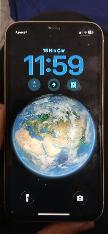 Qutuda/şəkillərdə: ağ arxa panelli iPhone 11. Ekran görüntülərində Azərbaycan dili interfeysi və widgetlər görünür. Ağ korpuslu modeldir.