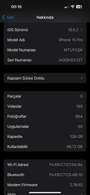 15 pro 128gb 90% pil səviyyəsi 477 devr sayı var Alınan gündən 360 dərəcə vinil vurulub. Nöqtə cızığ yoxdu. Təzədən fərqi pilin 90 olmasıdı. Yeni telefon aldığım üçün satıram. Əlim yanmır qiymə...