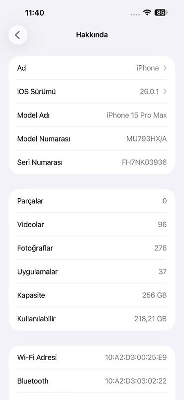 - Batareya məlumatı: Pil Sağlığı bölməsinə görə Maksimum Tutum 96%, Devir sayı 241