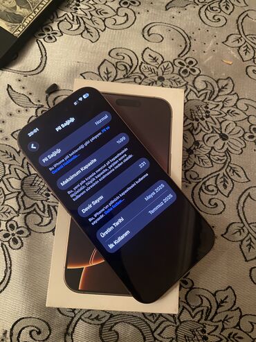 Məhsul: Apple iPhone 16 Pro Max QİYMƏT 1700 Azn Telefonu qadin işlədib hecbir ciziq ləkə yoxdur, ustada olmayib heçvaxt və acilmayib.Bütün funksiyaları işləyir.Pil 92% yaddas 256gb.Qutusu və orgi...