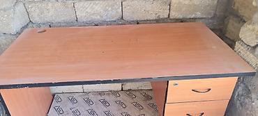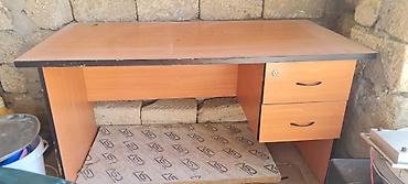 Tünd rəngli ofis/iş masası - Material: Laminat/MDF tipli taxta örtük, möhkəm konstruksiya - Ölçülər (təxmini): 120–140 sm en, 60–70 sm dərinlik, 74–76 sm hündürlük - Sol tərəfdə 3 çekmece: iki adi...