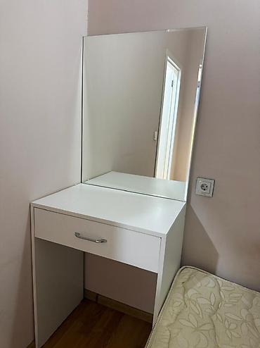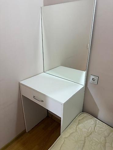 Ağ rəngli sadə dizaynlı makyaj masası və böyük güzgü dəsti.