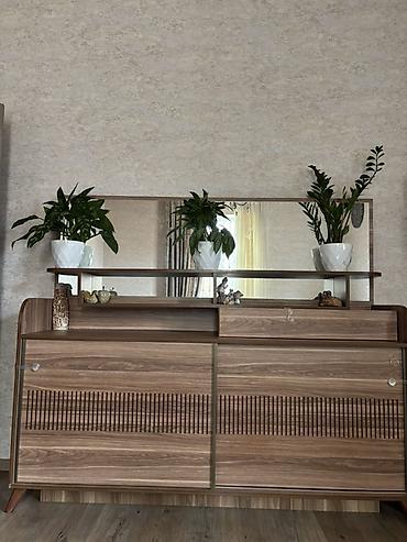 Mebel dəsti – bufet/komod + böyük güzgü paneli .420 azn Endirim mümkündür - Material: yüksək keyfiyyətli laminat/LDSP, ceviz (qoz) teksturası - Rəng: təbii qoz tonları, dekorativ şaquli frez xəttl...