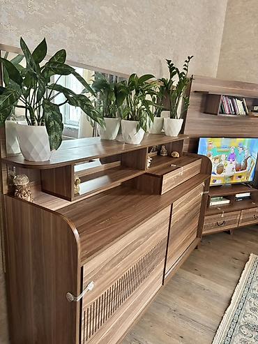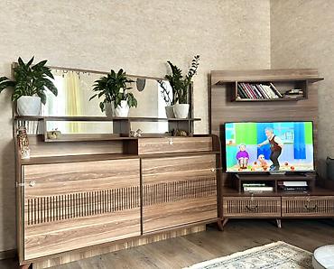 Qonaq otağı üçün mebel dəstı Tərkibi: - TV stendi: geniş üst panel, orta hissədə TV platforması, aşağıda 2 iri çəkmece və yan qapalı bölmə. Üstdə dekor üçün rəf. Kabel çıxışları üçün arxa hissədə ...