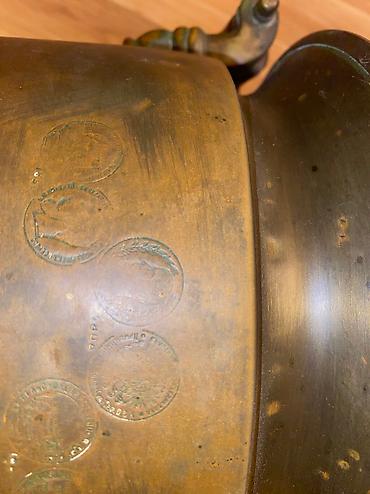 Salam.Qədimi Antika samovar.Ayağında sinəsində qapağında peçatlar var.Vəziyyəti yaxşıdır.Yüngül bərpa işləri lazımdır.Qiymətini bilən bilir bunların.6 litrdir.150 yə yaxın yaşı var.