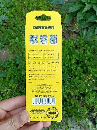Qutu məlumatı: DENMEN brendi, “High Speed Data Cable”, “For Type‑C Charging Data Cable”, “Beautiful accessories”. Made in China. CE və RoHS nişanları.