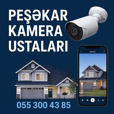Xidmət: Peşəkar kamera ustaları – obyektlərə videomüşahidə quraşdırılması və mobil tətbiq üzərindən izləmə inteqrasiyası (şəkildə göstərilib).