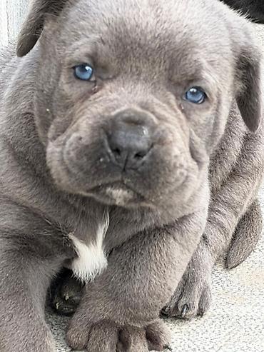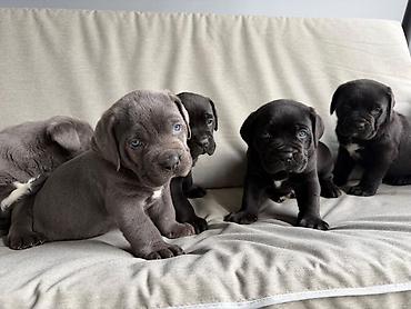Cane Corso balaları - Cins: Cane Corso (İtalyan mastifi tipli iri cins) - Rənglər: qara və boz (mavi ton) - Yaş xüsusiyyəti: balaca mərhələ, güclü skelet quruluşu, geniş baş və qısa tüklü parlaq d...
