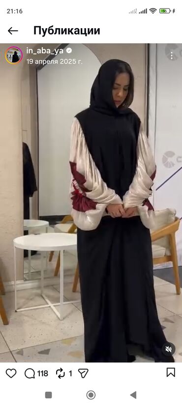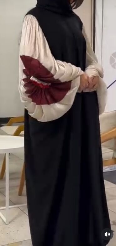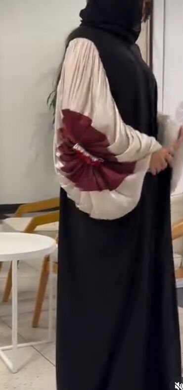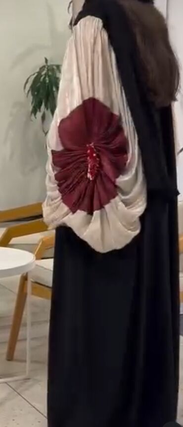Etnik üslublu qadın üst geyimi – qara rəngli, azad kəsimli kimono/abizə tipli kaftan. Ön hissədə iki dekorativ panel var: - solda: çoxrəngli boncuklar, düyməvari elementlər və naxışlı parça; - sağd...