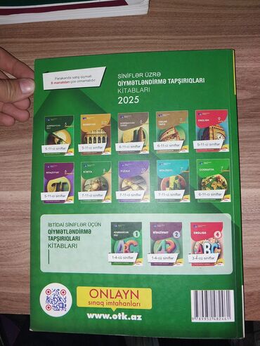 - Qeyd: Arxa qapaqda 2025-ci il üçün digər fənnlərin qiymətləndirmə tapşırıqları kitabları haqqında məlumat və www.otk.az onlayn sınaqları üçün QR kod yerləşir.