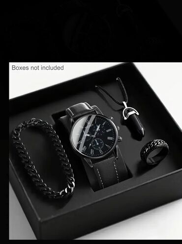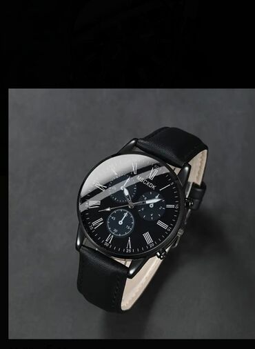 - Qara klassik qol saatı: qara siferblat, Roma rəqəmləri, çoxfunksiyalı dizaynlı alt siferblatlar, “MSCXDK” loqosu; qara dəri qayış, metal korpus.