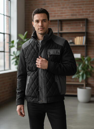 Qara rəngli kişi qış gödəkçəsi - Model: qabarıq tikişli, kapüşonlu