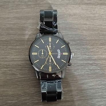 Kişi qol saatları – klassik dizayn - Mexanizm: Quartz - Göstəricilər: 12 saatlıq şkala, saat/dəqiqə/saniyə əqrəbləri - Siferblat: Qara fonda qızılı tonlu indekslər və rəqəmlər (2,4,6,8,10,12) - Ko...