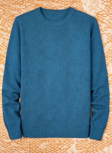 - Model 1: Mavi, dairəvi yaxalı klassik trikotaj sviter. Üzərində ziqzaqvari rellefli (ton-in-ton) naxış işləməsi var. Uzunqol, bel və qollar ribana manjetlidir. Sadə və gündəlik istifadə üçün uyğundur, köynək və ya t‑şört üzərinə rahat kombinlənir.