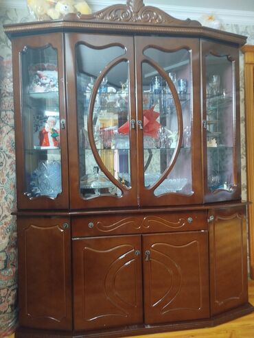 Taxta bufet-vitrin - Material: cilalanmış ağac, lak örtük - Dizayn: ön hissədə şüşəli vitrin bölmələri, dekorativ qızılı naxış işləmələri; yuxarı hissədə geniş şüşə vitrin, ortada bir qapılı taxta...
