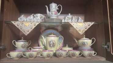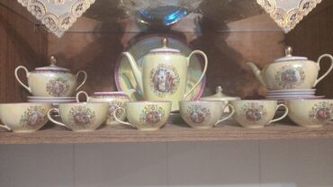 - Porselen çay-servis dəstləri və dekorativ samovar 1) Qəhvəyi-qızılı naxışlı klassik çay-servis (şəkil 1) - Üzərində romantik süjetli təsvirlər və qızılı işləmələr - Dəst tərkibi: şüşəli qapaqlı ...